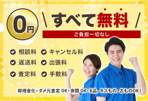 品物が届き次第、到着当日に査定し承諾後すぐ入金というスピード対応。お忙しい方や、遠方の方に特に好評です。梱包に不安がある方には、マニュアルや動画ガイドもあります。返送料も当社負担ですので、買取額に納得いただけなかった場合でも安心です。