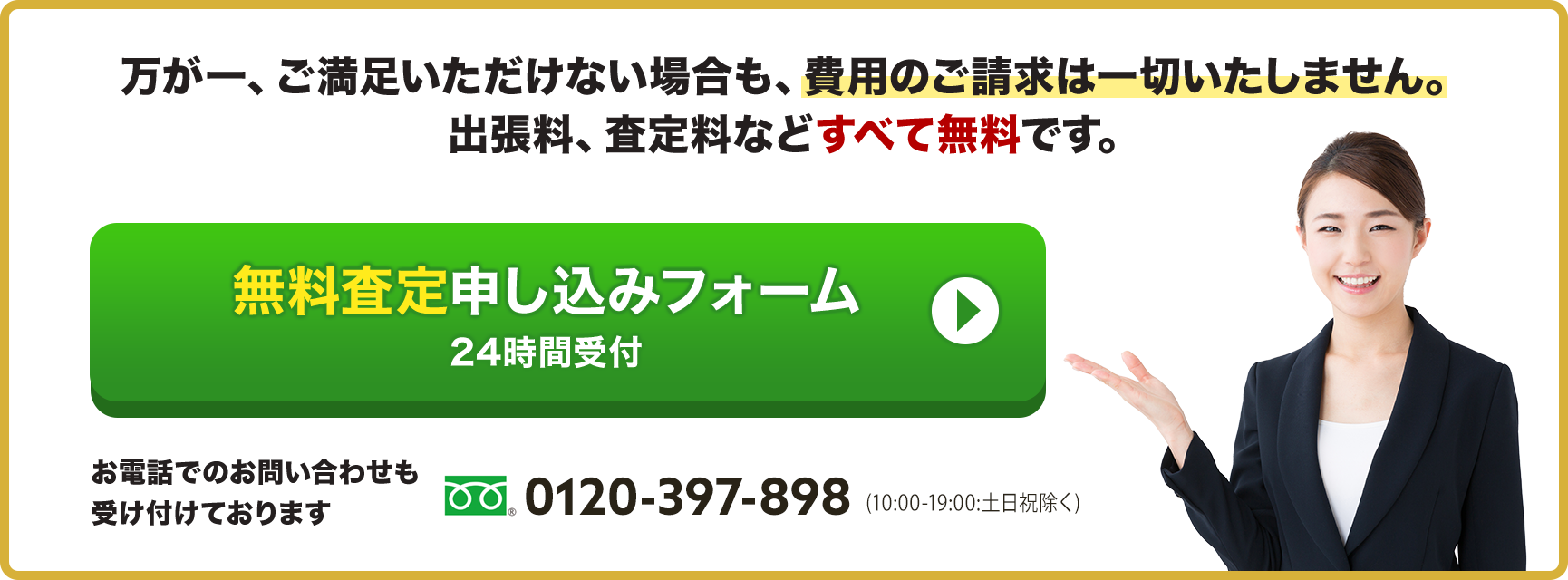 出張料・査定料・キャンセル料はすべて無料。埼玉県内はもちろん、隣県(東京・群馬・栃木・茨城・千葉)にも対応しています。お仕事やご家庭の都合に合わせて訪問時間を調整できますので、初めての方でも安心してご利用ください。