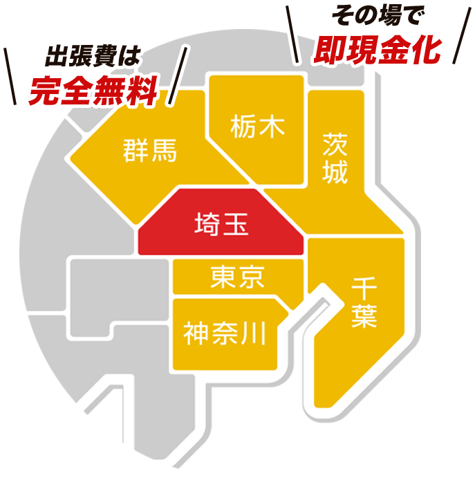 出張買取は、さいたま市・川口市・所沢市・越谷市・春日部市・熊谷市・上尾市・志木市・朝霞市など、各地域への最短当日訪問が可能です。